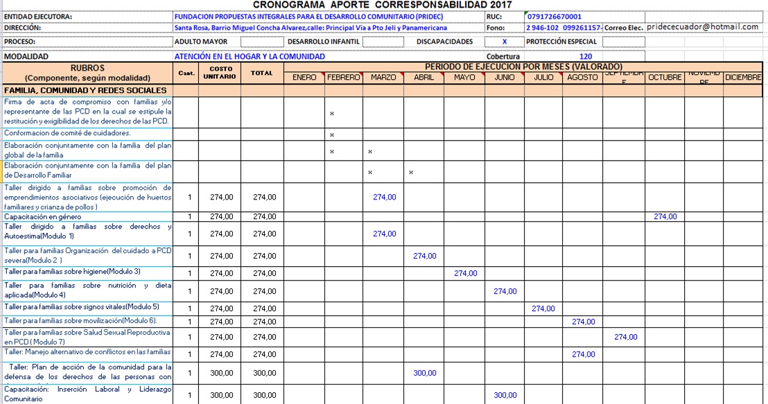 Implementar y ejecutar el servicio de ATENCIÓN EN EL HOGAR Y LA COMUNDIDAD para Personas con Discapacidad en el  Cantón  Santa  Rosa, a través de la  Organización Ejecutora Fundación  Social  Propuestas Integrales  para el Desarrollo Comunitario  “PRIDEC”,  conforme a la Norma Técnica y directrices del Ministerio de Inclusión Económica y Social.